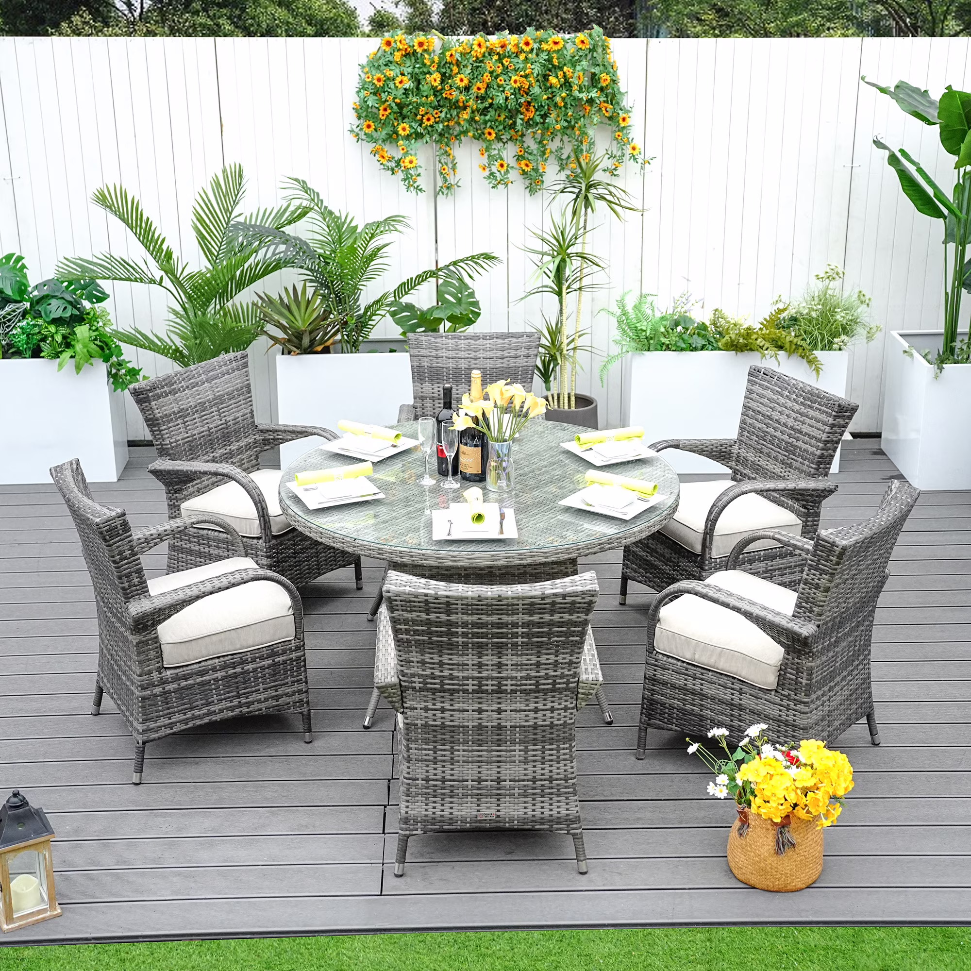 Direct Wicker 7 Piece Patio Dining Set with Rattan Chairs and Cushions, Grey