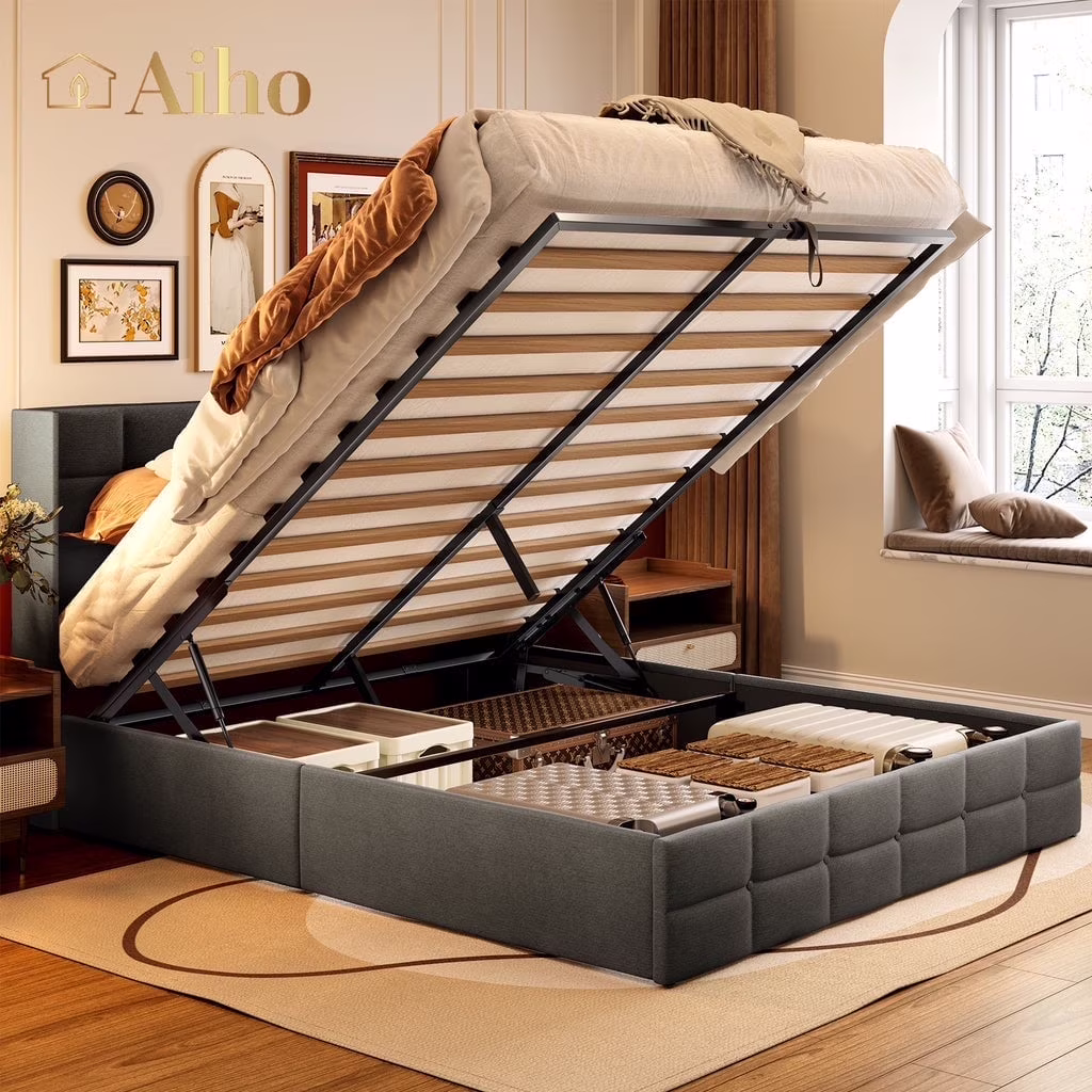 Aiho Full Lift Up Storage Bed, Full Size Bed Frame with Big Underneath Storage & Modern Wingback Headboard & No Box Spring Needed - Gray